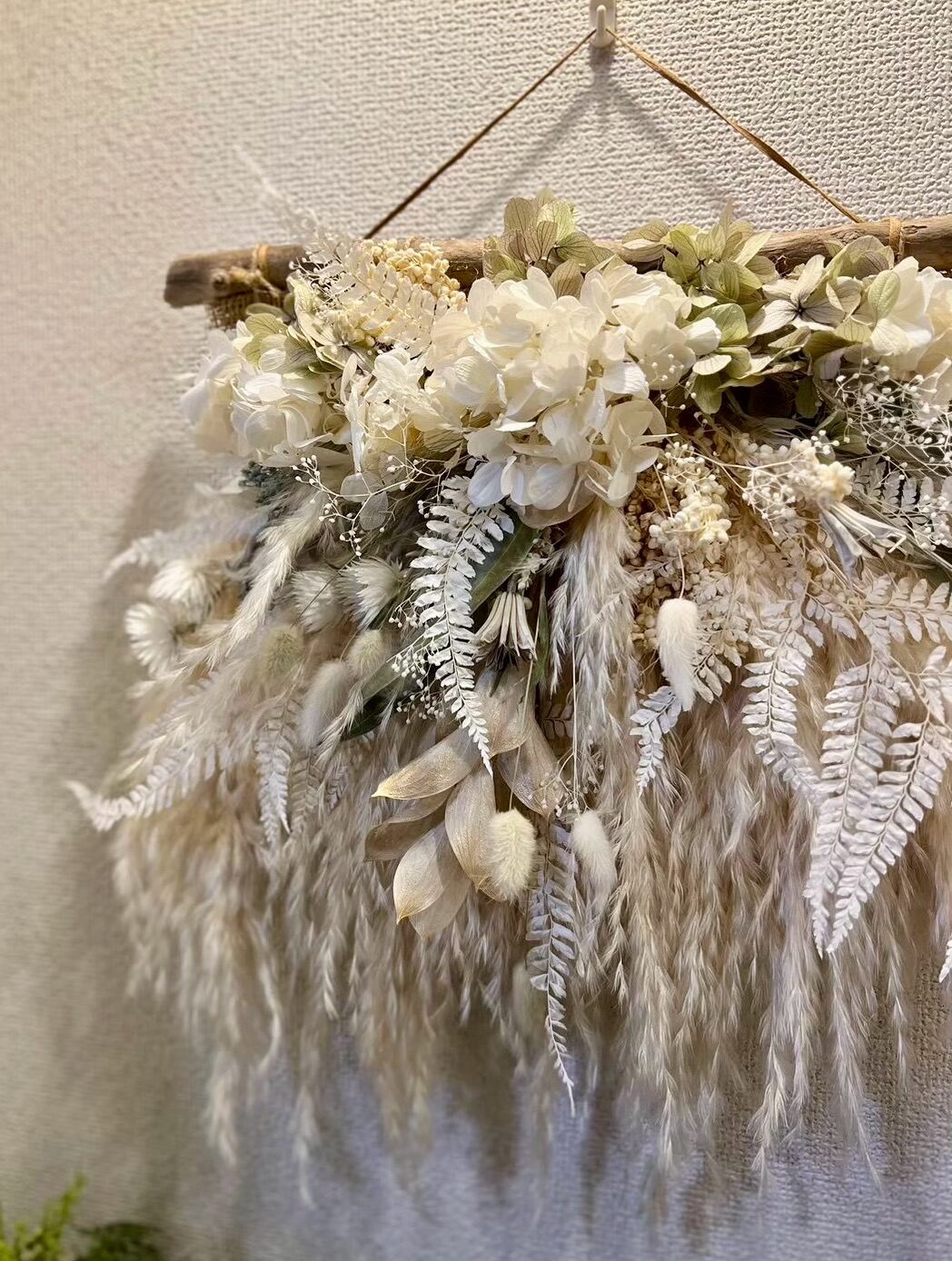 壁掛けタペストリー/壁掛けボードアレンジ/⽊の実のオブジェ/ビカクシダ板付壁掛け/フライングリース/縦⻑ガーランド/お正⽉飾り/ハーフムーンリース/フラワーキャンドル/アーティフィシャルフラワースワッグ/パンパスグラスのハンギングボール/スモークツリーのリース、etc